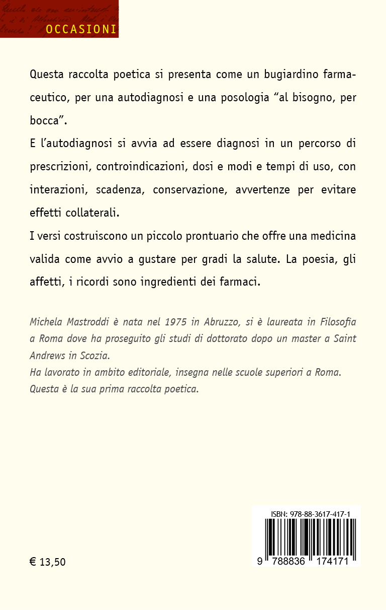 Questa raccolta poetica si presenta come un bugiardino farmaceutico, per una autodiagnosi e una posologia “al bisogno, per bocca”.