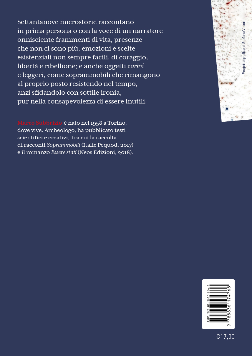 Settantanove microstorie raccontano in prima persona o con la voce di un narratore onnisciente frammenti di vita, presenze che non ci sono più, emozioni e scelte esistenziali non sempre facili, di coraggio, libertà e ribellione; e anche oggetti carini e leggeri, come soprammobili che rimangono al proprio posto resistendo nel tempo, anzi sfidandolo con sottile ironia, pur nella consapevolezza di essere inutili.
