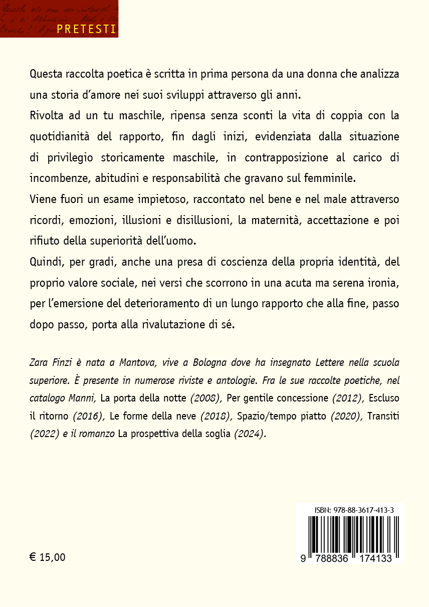 Questa raccolta poetica è scritta in prima persona da una donna che analizza una storia d’amore nei suoi sviluppi attraverso gli anni.