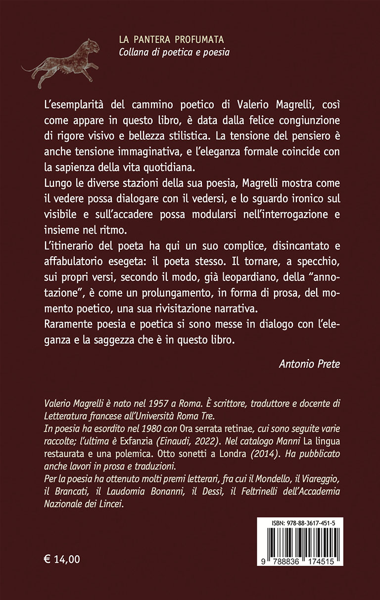 Lungo le diverse stazioni della sua poesia, Magrelli mostra come il vedere possa dialogare con il vedersi, e lo sguardo ironico sul visibile e sull’accadere possa modularsi nell’interrogazione e insieme nel ritmo.