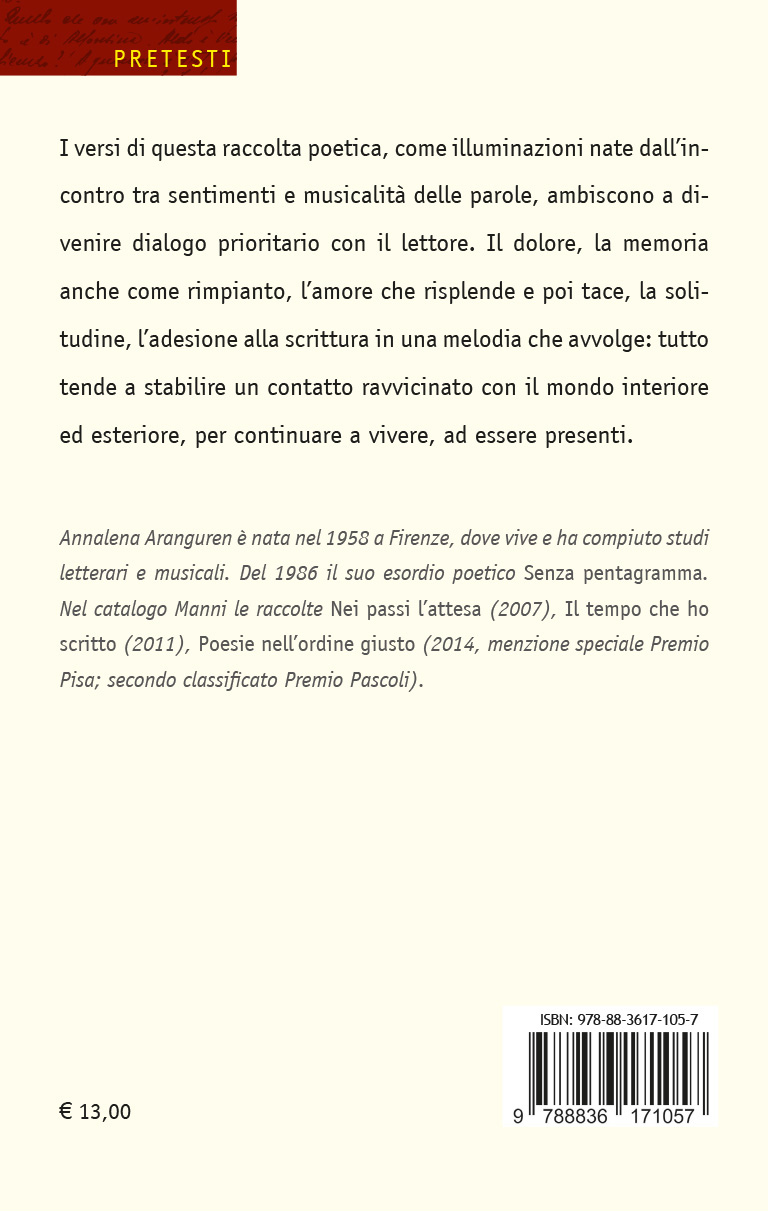 I versi di questa raccolta poetica, come illuminazioni nate dall’incontro tra sentimenti e musicalità delle parole, ambiscono a divenire dialogo prioritario con il lettore. Il dolore, la memoria anche come rimpianto, l’amore che risplende e poi tace, la solitudine, l’adesione alla scrittura in una melodia che avvolge: tutto tende a stabilire un contatto ravvicinato con il mondo interiore ed esteriore, per continuare a vivere, ad essere presenti.