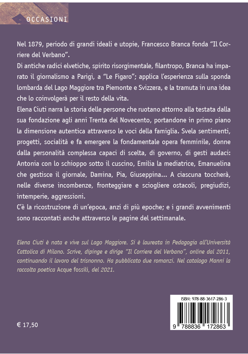 Elena Ciuti narra la storia delle persone che ruotano attorno alla testata dalla sua fondazione agli anni Trenta del Novecento, portandone in primo piano la dimensione autentica attraverso le voci della famiglia. Svela sentimenti, progetti, socialità e fa emergere la fondamentale opera femminile, donne dalla personalità complessa capaci di scelta, di governo, di gesti audaci: Antonia con lo schioppo sotto il cuscino, Emilia la mediatrice, Emanuelina che gestisce il giornale, Damina, Pia, Giuseppina... A ciascuna toccherà, nelle diverse incombenze, fronteggiare e sciogliere ostacoli, pregiudizi, intemperie, aggressioni.