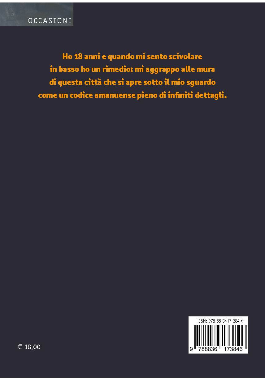 Ho 18 anni e quando mi sento scivolare in basso ho un rimedio: mi aggrappo alle mura di questa città che si apre sotto il mio sguardo come un codice amanuense pieno di infiniti dettagli.