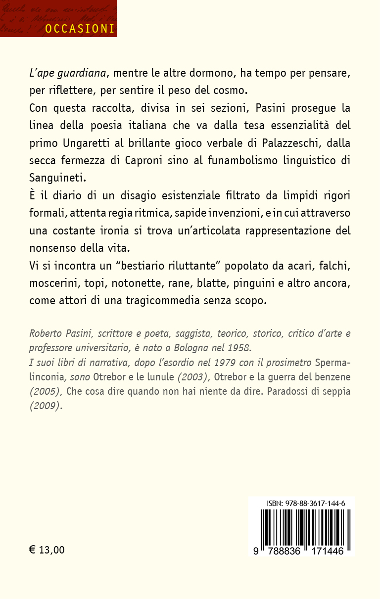 Con questa raccolta, divisa in sei sezioni, Pasini prosegue la linea della poesia italiana che va dalla tesa essenzialità del primo Ungaretti al brillante gioco verbale di Palazzeschi, dalla secca fermezza di Caproni sino al funambolismo linguistico di Sanguineti.