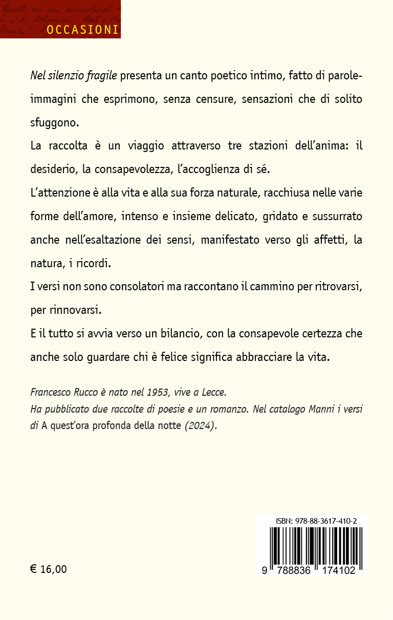 Nel silenzio fragile presenta un canto poetico intimo, fatto di parole-immagini che esprimono, senza censure, sensazioni che di solito sfuggono.
