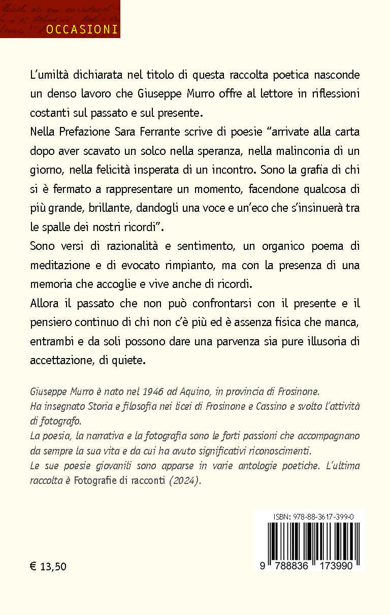 L’umiltà dichiarata nel titolo di questa raccolta poetica nasconde un denso lavoro che Giuseppe Murro offre al lettore in riflessioni costanti sul passato e sul presente.