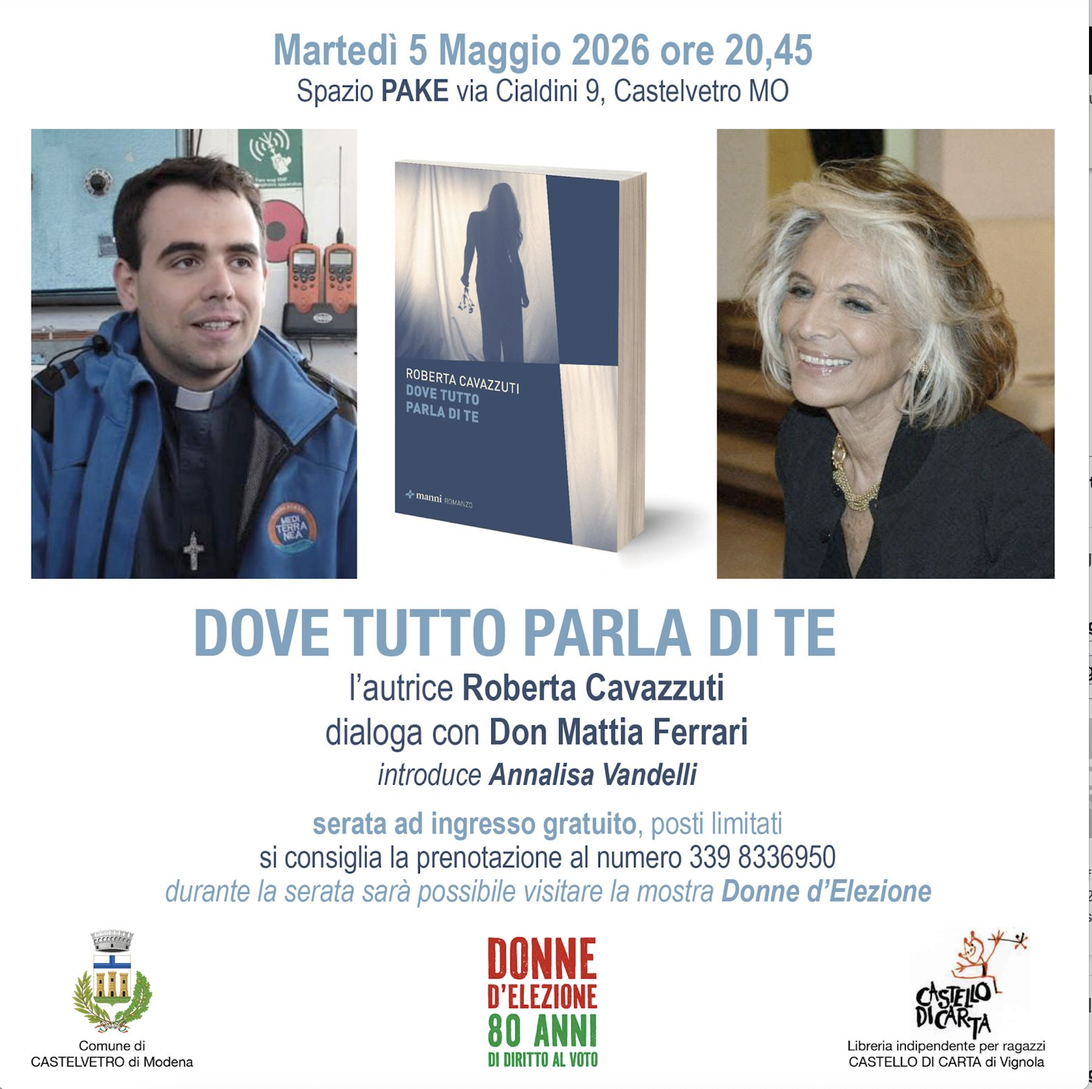 Martedì 5 maggio alle ore 20.45 Roberta Cavazzuti presenta Dove tutto parla di te allo Spazio Pake in via Cialdini 9 a Castelvetro, con don Mattia Ferrari e Annalisa Vandelli.