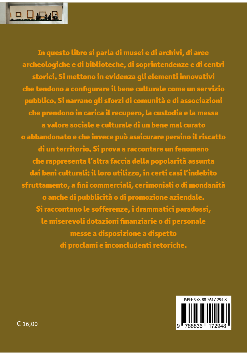 In questo libro si parla di musei e di archivi, di aree archeologiche e di biblioteche, di soprintendenze e di centri storici. Si mettono in evidenza gli elementi innovativi che tendono a configurare il bene culturale come un servizio pubblico. Si narrano gli sforzi di comunità e di associazioni che prendono in carico il recupero, la custodia e la messa a valore sociale e culturale di un bene mal curato o abbandonato e che invece può assicurare persino il riscatto di un territorio. Si prova a raccontare un fenomeno che rappresenta l’altra faccia della popolarità assunta dai beni culturali: il loro utilizzo, in certi casi l’indebito sfruttamento, a fini commerciali, cerimoniali o di mondanità o anche di pubblicità o di promozione aziendale. Si raccontano le sofferenze, i drammatici paradossi, le miserevoli dotazioni finanziarie o di personale messe a disposizione a dispetto di proclami e inconcludenti retoriche.