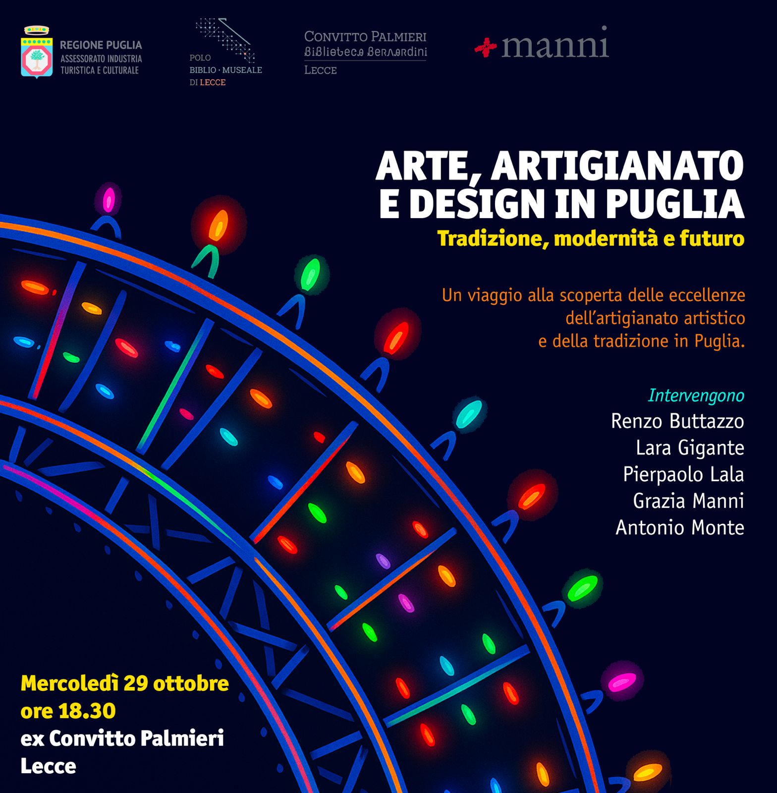 Mercoledì 29 ottobre alle 18.30 presso l'ex Convitto Palmieri di Lecce si presenta Arte, artigianato e design in Puglia. Intervengono i curatori Lara Gigante e Pierpaolo Lala, con Renzo Buttazzo, Grazia Manni e Antonio Monte.