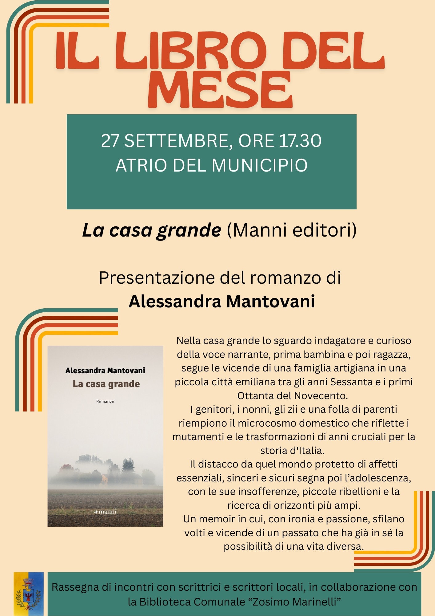 Sabato 20 settembre alle ore 18 Alessandra Mantovani presenta La casa grande a Ciriè (Torino), presso la Libreria Ca' Libro in via Nino Costa 17.