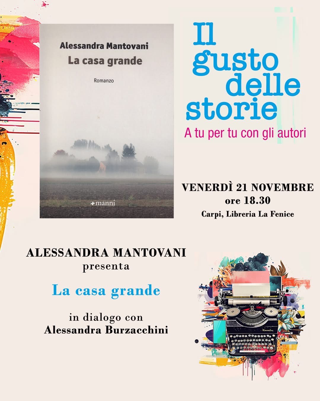 Venerdì 21 novembre sarà la volta di Carpi, alla libreria La fenice, con Alessandra Burzacchini.